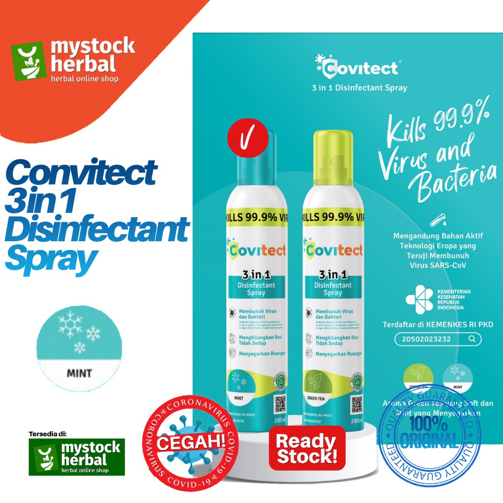 Convitect 3 in 1 Spray Disinfectant 280ml-MINTHarga tertera adalah harga satuan.Barang Dijamin Asli 100%, Ready Stock!Lindungi Keluarga Anda Dari Virus!Golongan: DisinfektanKemasan: Botol Spray 280 mlTerdaftar di Kementrian Kesehatan RI No. PKD 20502032232Exp.: Jan 2023Barang yang rusak atau pecah akibat pengiriman menjadi tanggung jawab pembeli. Supaya aman lengkapi paket anda dengan bubble wrap dan karton kardus pembungkus.Indikasi Umum/Manfaat:Covitect 3 in 1 Disinfectant Spray merupakan aerosol spray untuk disinfeksi udara dan permukaan benda. Menggunakan bahan aktif teknologi Eropa. Mampu membunuh 99.9% virus, bakteri dan jamur penyebab penyakit.Covitect menggunakan teknologi aerosol spray yang praktis dan menghasilkan persebaran merata di ruangan. Cocok untuk digunakan di berbagai tempat, baik di udara maupun di permukaan benda.Tambah bubble wrap dan karton kadus sebagai pembungkus pengaman extra biar paket lebih aman. Bubble wrap dan karton dapat dibeli disini.#disinfektan #disinfektanspray #disinfektanconvitect #pengharumru