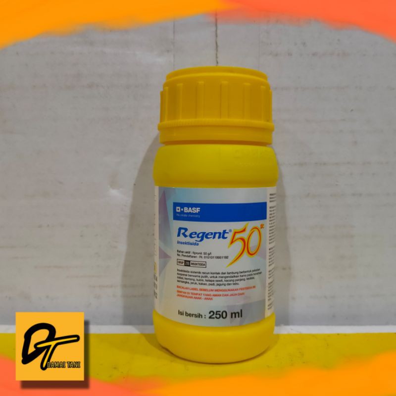 Regent 50 SC merupakan pestisida untuk membasmi berbagai hama serangga yang sudah dilengkapi dengan ZPT (zat pengatur tumbuh) untuk proses pemulihan dan perlindungan pada tanaman setelah terkena hama serangga. Regent 50 SC termasuk jenis insektisida sistemik yang dapat memblokir jalannya ion klorida yang membawa asam gama-amino-butirik (GABA) ke sistem saraf pusat serangga sehingga ketika sebagian hama serangga sudah terkena maka seluruh hama serangga lain di sekitar akan ikut mati.Dapat digunakan untuk membasmi hama pada tanaman cabai, jagung, jeruk, kacang panjang, kedelai, kelapa sawit, kubis, kentang, padi, semangka, tebuSangat efektif untuk membasmi hama thrips (kutu daun), belalang, orong-orong, semut, rayap, kutu loncat, walang sangitVolume: 250mlBahan aktif: fipronil 50 g/lInsektisida sistemik racun kontak, lambung dan zat pengatur tumbuh tanaman berbentuk pekatan susp