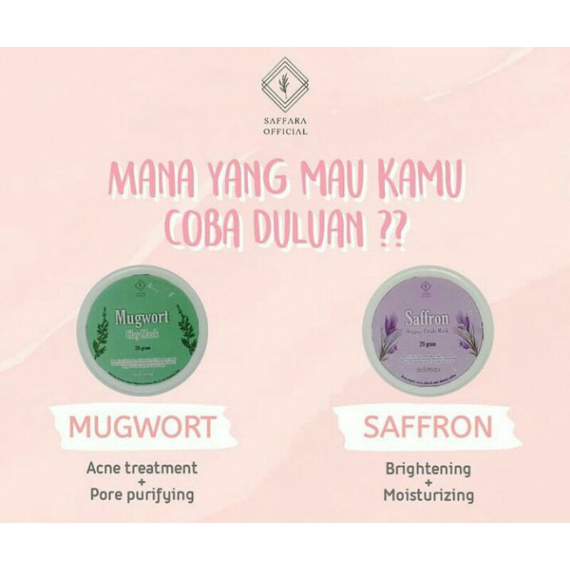 Manfaat Masker Petals Saffron :-Melindungi kulit dari sinar UV-Kaya Antioksidan-Melembabkan wajah-Mencerahkan wajah-Menghilangkan mata panda dan menyamarkan bekas jerawatIngredients :Rice organic, saffron petals, honey, apple, olive oil, aloeveraMugwort memiliki kandungan antioksidan yang sama dengan vitamin C. Selain itu, mugwort memiliki sifat anti bakteri dan anti inflamasi yang berfungsi untuk menenangkan kulit wajah yang kemerahan akibat iritasi, mengatasi beruntusan serta jerawat. Mugwort juga mengandung vitamin E dan dapat berfungsi untuk memperkuat skin barrier yang sangat penting untuk perawatan wajah.Ingredients :Kaolin Clay, Artemisia vulgaris (Mugwort), Aloevera, Apple, Olive oil, Jicama,