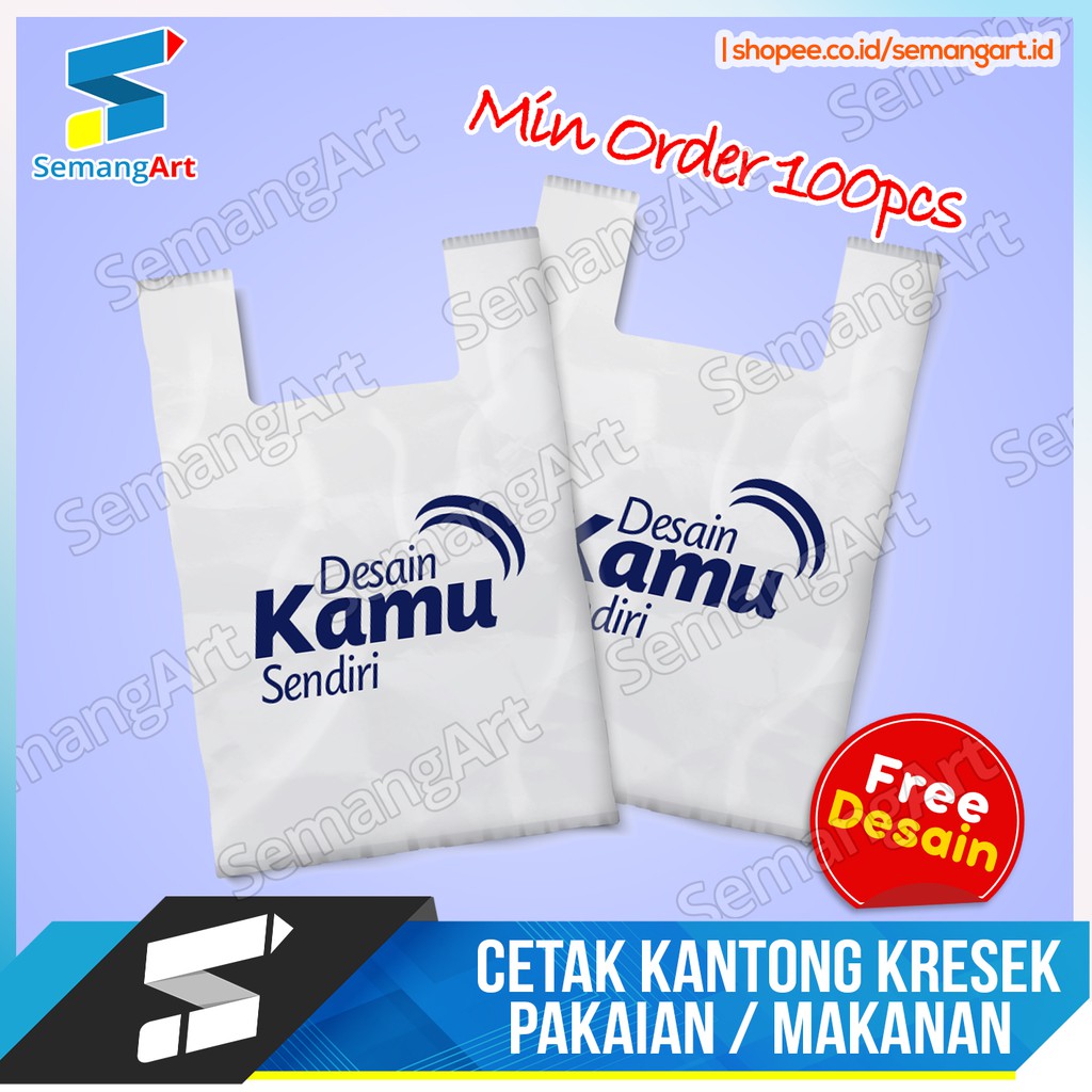 Deskripsi Produk :- Harga tertera untuk satu pcs Plastik + Sablon.- Pemesanan minimal 100 pcs.Bahan produk :- Plastik Kresek HDPE.- Sablon 1 warna 1 sisi.- Produk selalu ready (made by order).- Proses pesanan kurang lebih 10 hari, tergantung banyaknya antrian.- Kesalahan cetak karena kesalahan File dari konsumen diluar tanggung jawab kami.CARA PEMESANAN1. Klik Order2. Silahkan isi keterangan sesuai template3. Jika ingin menggunakan file sendiiri, file bisa dikirim ke semangart.id@gmai