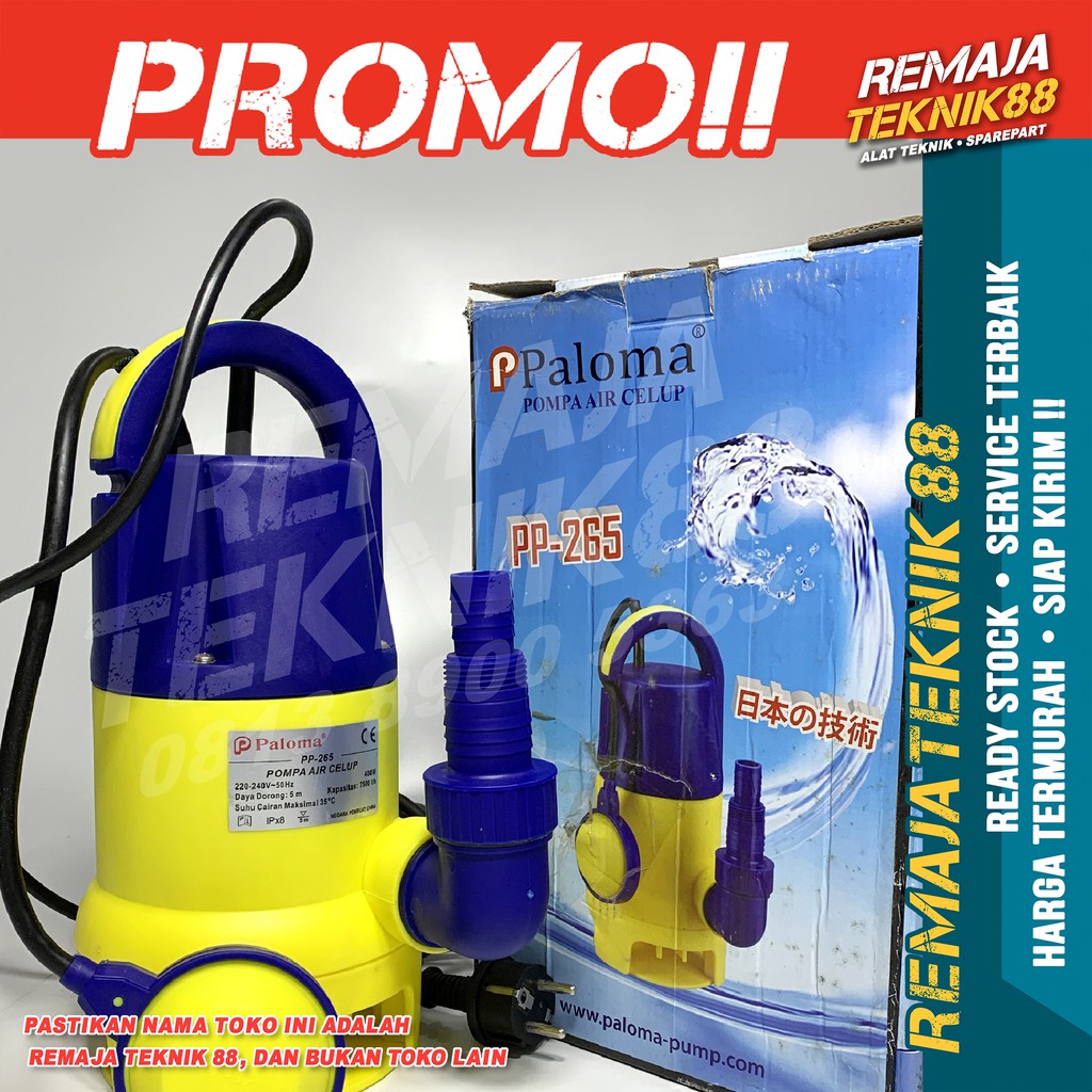 Nama Produk : PALOMA PP-265 POMPA CELUP AIRUntuk pertanyaan lebih lanjut silahkan hubungi kami Kami juga menjual spare part (suku cadang) dan menyediakan service segala macam alat teknikKegunaan :- pompa air celup- untuk menguras kolam, ledeng atau bakKeunggulan :- dapat digunakan untuk air kotor maupun air bersih- daya hisap yang kuatSpesifikasi :- Tegangan : 220-240v- Daya : 400 Watt- Kapasitas Maksimum : 7500 liter per jam- Daya dorong maksimum : 5 Meter- Ukuran outlet : 1" , 1,25" dan 1,5 "- Suhu air : 35 drajat celciusProduk sejenis :Barang kami SELALU BARU, BERKUALITAS, CEPAT KIRIMAdmin kami SELALU FAST RESPONdan tentunya READY STOCKWAJIB BACA SYARAT DAN KETENTUAN TOKO KAMISebelum membeli produk dari Toko Remaja Teknik 88MENGENAI PENGIRIMAN-JNE, TIKI, JNT, Wahana, Ninja Express, Sicepat dan Pos Indonesia Dikirim mulai Pukul 9 pagi sampai 5 sore, setelahnya dikirim keesokan harinya-GRAB adan GOJEKDikirim mulai Pukul 9 pagi sampai 3.30 sore, setelahnya dikirim keesokan harinyaJangan lupa berikan PUASBila anda SENANG dengan layanan kamiSelamat berbelanja sobat re